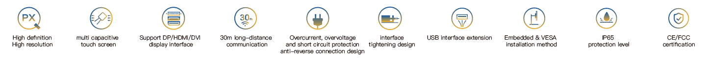 PD-8823 is an embedded ultra-thin industrial touch panel. It is equipped with a 23.8 "high-definition LCD screen with a resolution of 1920x1080 and a projected multi-point capacitive touch screen. It supports three signal transmission interfaces: HDMI, DVI and DP, as well as multiple USB2.0 interface expansions. The maximum communication distance between the PC and the touch panel can reach 30 meters, and the entire machine is powered by DC24V. The front panel has an IP65 protection rating. All interfaces are designed with fastening and have passed CE/FCC certification, making it suitable for demanding human-machine interaction industrial sites.