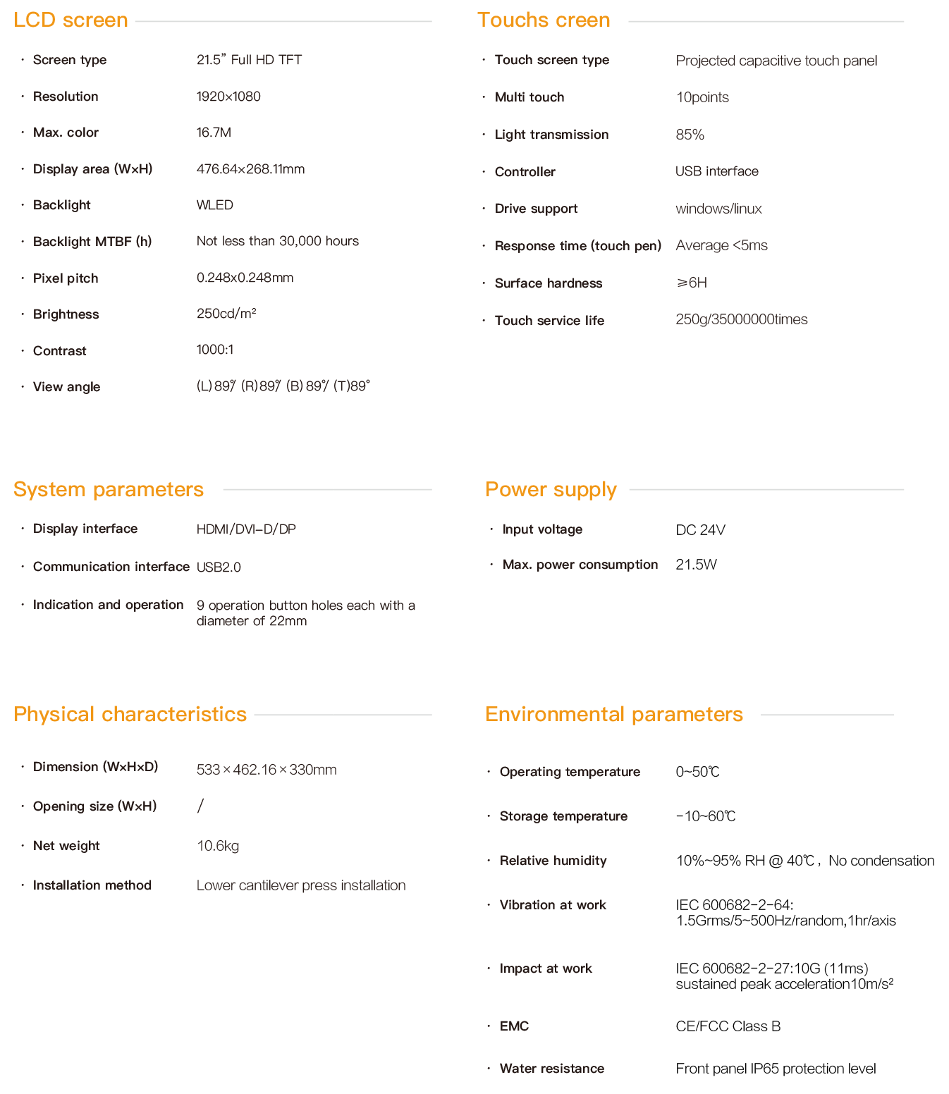 The PDX-3821 is a horizontal industrial touch panel with a cantilever mounting at the bottom. It is equipped with operation buttons and a keyboard stand, featuring a 21.5 "high-definition LCD screen with a resolution of 1920x1080 and a projected multi-touch capacitive screen. It supports three signal transmission interfaces: HDMI, DVI and DP, as well as multiple USB2.0 interface expansions. The maximum communication distance between the PC and the touch panel can reach 30 meters, and the entire machine is powered by DC24V. The front panel has an IP65 protection rating. All interfaces are designed with fastening and have passed CE/FCC certification, making it suitable for demanding human-machine interaction industrial sites.