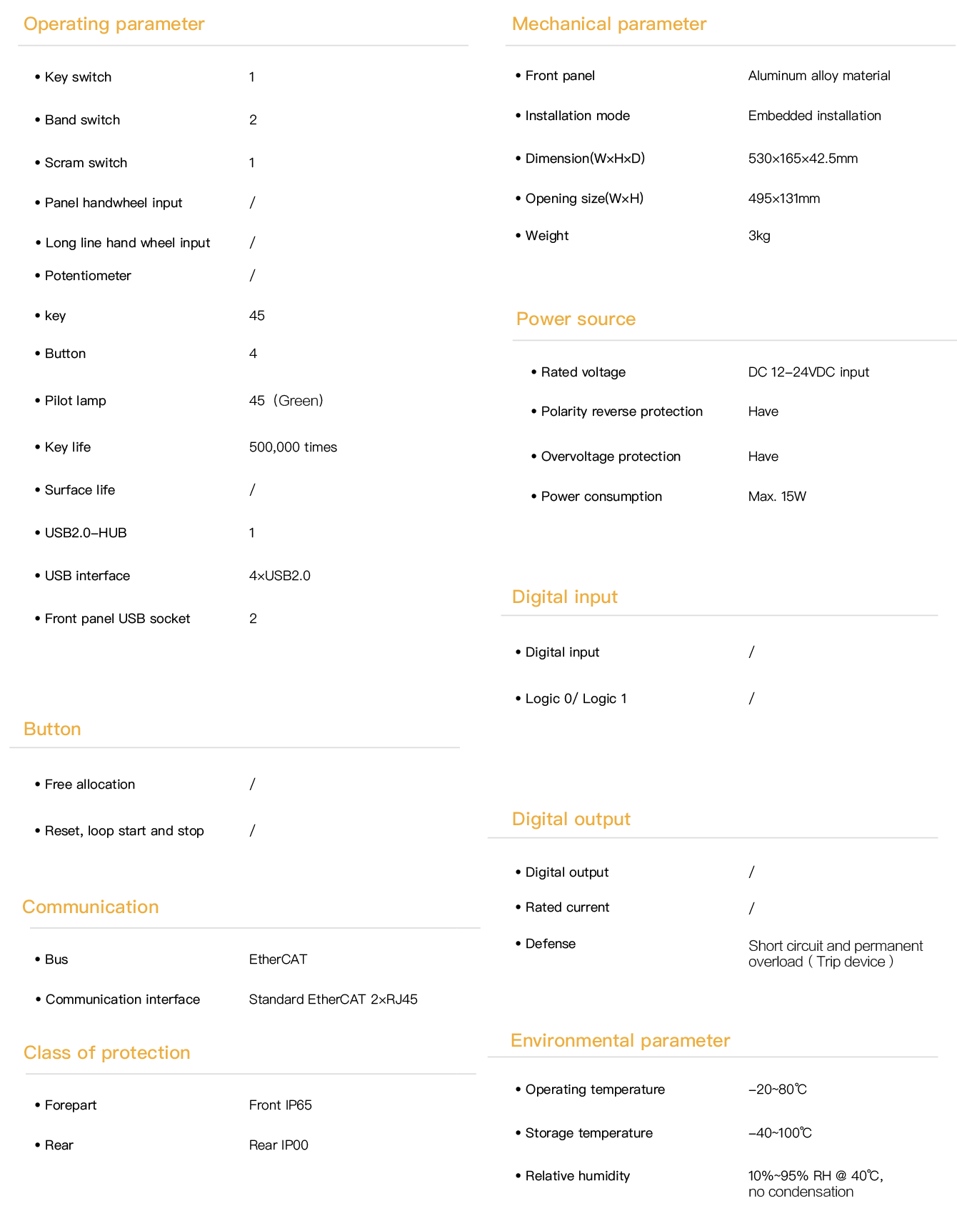 EC-8103 is a high-performance operation panel based on the EtherCAT industrial Ethernet bus, achieving high-speed and reliable human-machine interaction. As a dedicated HMI operation panel, it is equipped with 45 operation keys, 45 status indicator lights, 2 21-position Gray code band switches, 1 4-port USB2.0-HUB, 1 key switch, 1 emergency stop switch, and 4 button switches with lights. The default power input is 24V DC. The power connector adopts a spring-pressed green terminal to prevent accidental detachment during use. The whole machine adopts an anti-interference design, which can effectively resist the interference of high-power motors, servos, etc. in industrial sites. Ensure a good touch experience and adapt to various industrial sites with complex electromagnetic environments. The EC-8103 achieves embedded installation through hooks, which is convenient for installation and maintenance.