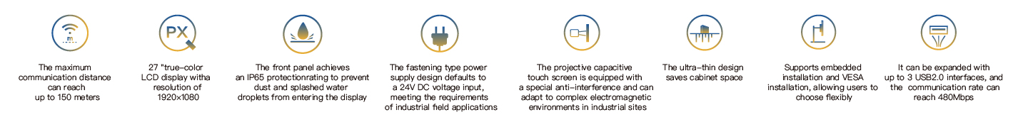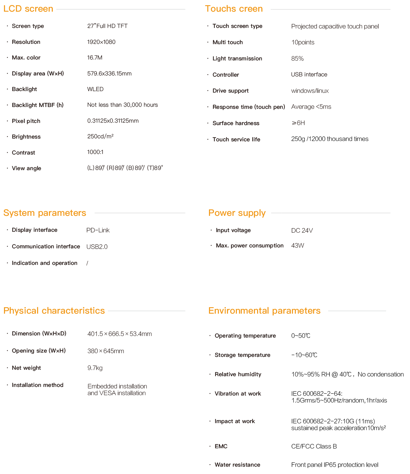 PD-8627 is a high-performance industrial remote transmission touch display panel. It is equipped with a 27 "high-definition LCD screen with a resolution of 1920x1080 and supports the PD-Link display interface. By default, it supports a 24V DC power input. The power connector adopts a secure green terminal to prevent accidental detachment during use. The touch screen adopts a projected capacitive touch screen, supporting up to 10 touch points at most. The display and touch sections have a special anti-interference design, which can effectively resist the interference from high-power motors, servos, etc. in industrial sites. Ensure good display effect and touch experience, and adapt to various industrial sites with complex electromagnetic environments.