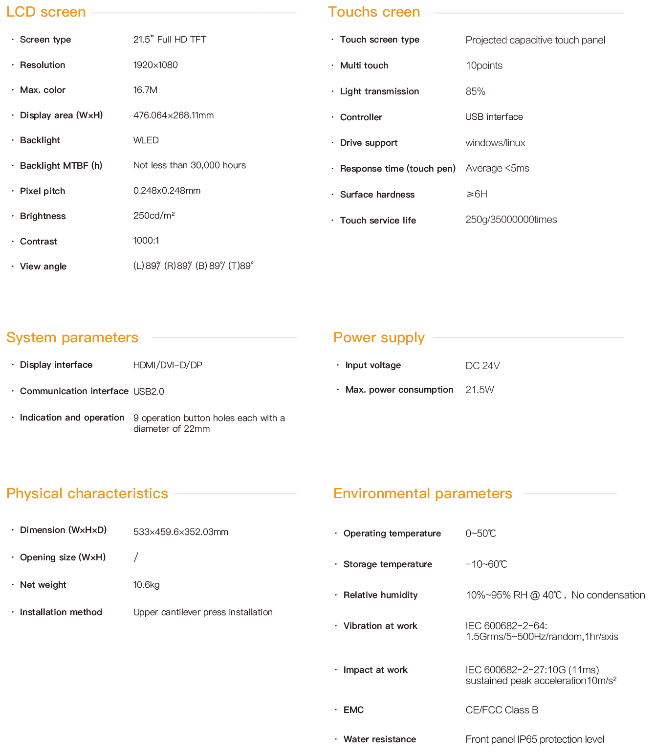 The PDS-6821 is a horizontal industrial touch panel with an upper cantilever installation. It is equipped with operation buttons and a keyboard stand, featuring a 21.5 "high-definition LCD screen with a resolution of 1920x1080 and a projected multi-touch capacitive screen. It supports three signal transmission interfaces: HDMI, DVI and DP, as well as multiple USB2.0 interface expansions. The maximum communication distance between the PC and the touch panel can reach 30 meters, and the entire machine is powered by DC24V. The front panel has an IP65 protection rating. All interfaces are designed with fastening and have passed CE/FCC certification, making it suitable for demanding human-machine interaction industrial sites.