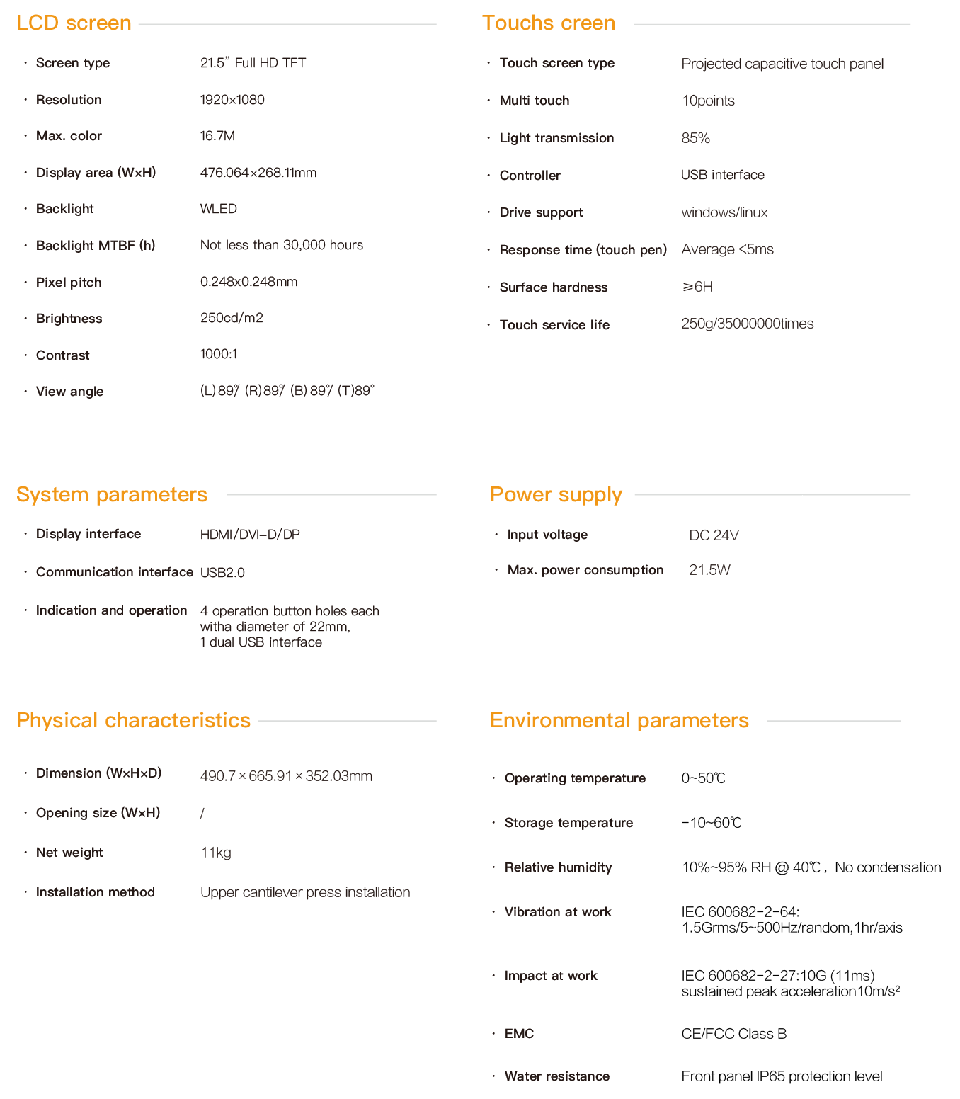 The PDS-6921 is a vertical industrial touch panel with an upper cantilever installation. It is equipped with operation buttons and a keyboard stand, featuring a 21.5 "high-definition LCD screen with a resolution of 1920x1080 and a projected multi-touch capacitive screen. It supports three signal transmission interfaces: HDMI, DVI and DP, as well as multiple USB2.0 interface expansions. The maximum communication distance between the PC and the touch panel can reach 30 meters, and the entire machine is powered by DC24V. The front panel has an IP65 protection rating. All interfaces are designed with fastening and have passed CE/FCC certification, making it suitable for demanding human-machine interaction industrial sites.