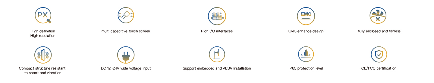 TPC-5632 is an embedded industrial capacitive touch tablet computer. It adopts a fanless and silent design, combining industrial display and touchscreen technology. The product is compact in structure, easy to install and convenient to operate. It is a high-performance and highly reliable industrial computer system. The whole machine adopts a 32-inch high-definition LCD screen with a resolution of 1920x1080, featuring rich and delicate colors and a wide viewing Angle. It is powered by a 12-24V wide-voltage DC and is equipped with a round-mouth DC power connector with locking screws to prevent accidental detachment. The touch control adopts a projected capacitive screen and supports 10-point touch simultaneously. The main unit is based on the IntelElkhartLake processing platform CPU, equipped with the J6412 processor and a large-capacity solid-state SSD. DDR4 memory supports 1x16G capacity, 4xUSB3.0, dual intel gigabit network cards, COM1 port supports RS232/422/485, COM2 port supports RS232/485. There is one M.2 expansion slot inside for 4G expansion, another M.2 for WIFI expansion, and one HDMI and one DP interface for multi-display mode. The TPC-5632 supports multiple installation methods: hook-mounted embedded installation, VESA-based wall-mounted and cantilevered installation. The front panel complies with the NEMA/IP65 water and dust resistance standard, preventing water splashes from entering during installation in the control cabinet. The high-strength all-steel sealed box structure has the functions of shock resistance and vibration protection. Especially, the specialized EMC design enables the entire machine to have excellent anti-interference ability and be able to adapt to the harsh working environment in industrial sites. It is widely applied in industrial scenarios with strong interference such as factory automation, mechanical manufacturing, numerical control equipment, textile equipment, communication networks and power automation.
