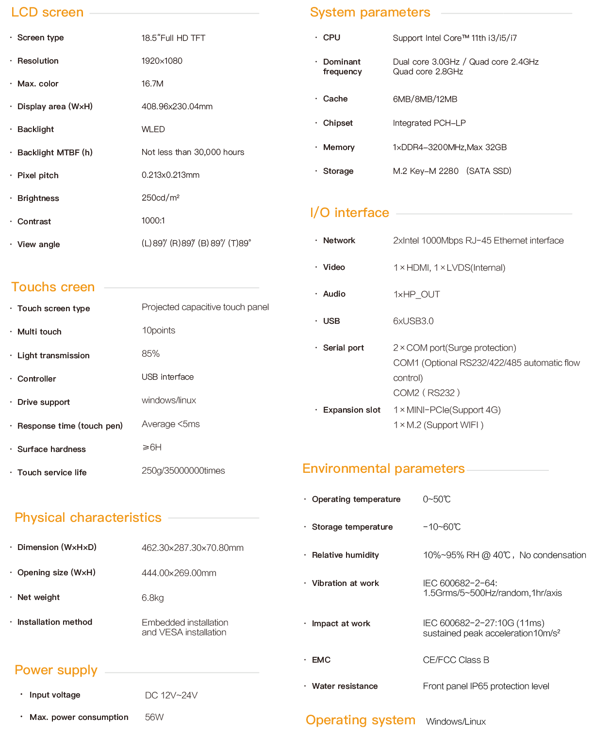 The PPC-7618 is an embedded industrial capacitive touch tablet computer. It adopts a fanless and silent design, combining industrial display and touchscreen technology. The product is compact in structure, easy to install and convenient to operate. It is a high-performance and highly reliable industrial computer system. The whole machine adopts an 18.5-inch high-definition LCD screen with a resolution of 1920x1080, featuring rich and delicate colors and a wide viewing Angle. It is powered by a 12-24V wide-voltage DC and is equipped with a round-mouth DC power connector with locking screws to prevent accidental detachment. The touch control adopts a projected capacitive screen and supports 10-point touch simultaneously. The main unit is equipped with an Intel 11th generation CPU and a large-capacity solid-state SSD. DDR4 memory supports a capacity of 1×32G. 6×USB3.0, dual intel gigabit network cards. COM1 supports RS232/422/485, and COM2 port supports R232. The internal MINI-PCIe and M.2 expansion slots facilitate I/O expansion for 4G, WIFI, etc. The PPC-7618 supports multiple installation methods: hook-mounted embedded installation, VESA-based wall-mounted and cantilevered installation. The front panel complies with the NEMA/IP65 water and dust resistance standard, preventing water splashes from entering during installation in the control cabinet. The high-strength all-steel sealed box structure has the functions of shock resistance and vibration protection. Especially, the specialized EMC design enables the entire machine to have excellent anti-interference ability and be able to adapt to the harsh working environment in industrial sites. It is widely applied in industrial scenarios with strong interference such as factory automation, mechanical manufacturing, numerical control equipment, textile equipment, communication networks and power automation.