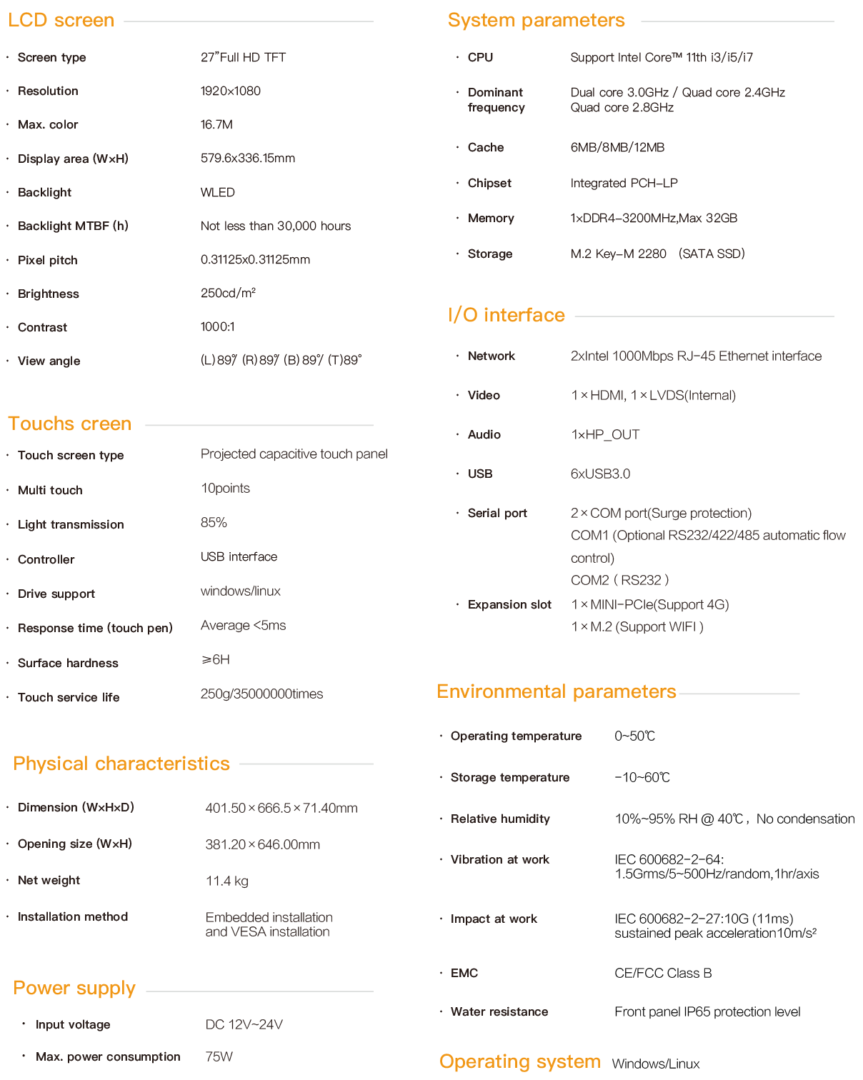 The PPC-7623 is an embedded industrial capacitive touch tablet computer. It adopts a fanless and silent design, combining industrial display and touchscreen technology. The product is compact in structure, easy to install and convenient to operate. It is a high-performance and highly reliable industrial computer system. The whole machine adopts a 23.8-inch high-definition LCD screen with a resolution of 1920x1080, featuring rich and delicate colors and a wide viewing Angle. It is powered by a 12-24V wide-voltage DC and is equipped with a round-mouth DC power connector with locking screws to prevent accidental detachment. The touch control adopts a projected capacitive screen and supports 10-point touch simultaneously. The main unit is equipped with an Intel 11th generation CPU and a large-capacity solid-state SSD. DDR4 memory supports a capacity of 1x32G and 6xUSB3.0. Dual inte gigabit network card, COM1 supports RS-232/422/485. The internal MINI-PCIe and M.2 expansion slots facilitate I/O expansion for 4G, WIFI, etc. The PPC-7623 supports multiple installation methods: hook-mounted embedded installation, VESA-based wall-mounted and cantilevered installation. The front panel complies with the NEMA/IP65 water and dust resistance standard, preventing water splashes from entering during installation in the control cabinet. The high-strength all-steel sealed box structure has the functions of shock resistance and vibration protection. Especially, the specialized EMC design enables the entire machine to have excellent anti-interference ability and be able to adapt to the harsh working environment in industrial sites. It is widely applied in industrial scenarios with strong interference such as factory automation, mechanical manufacturing, numerical control equipment, textile equipment, communication networks and power automation.