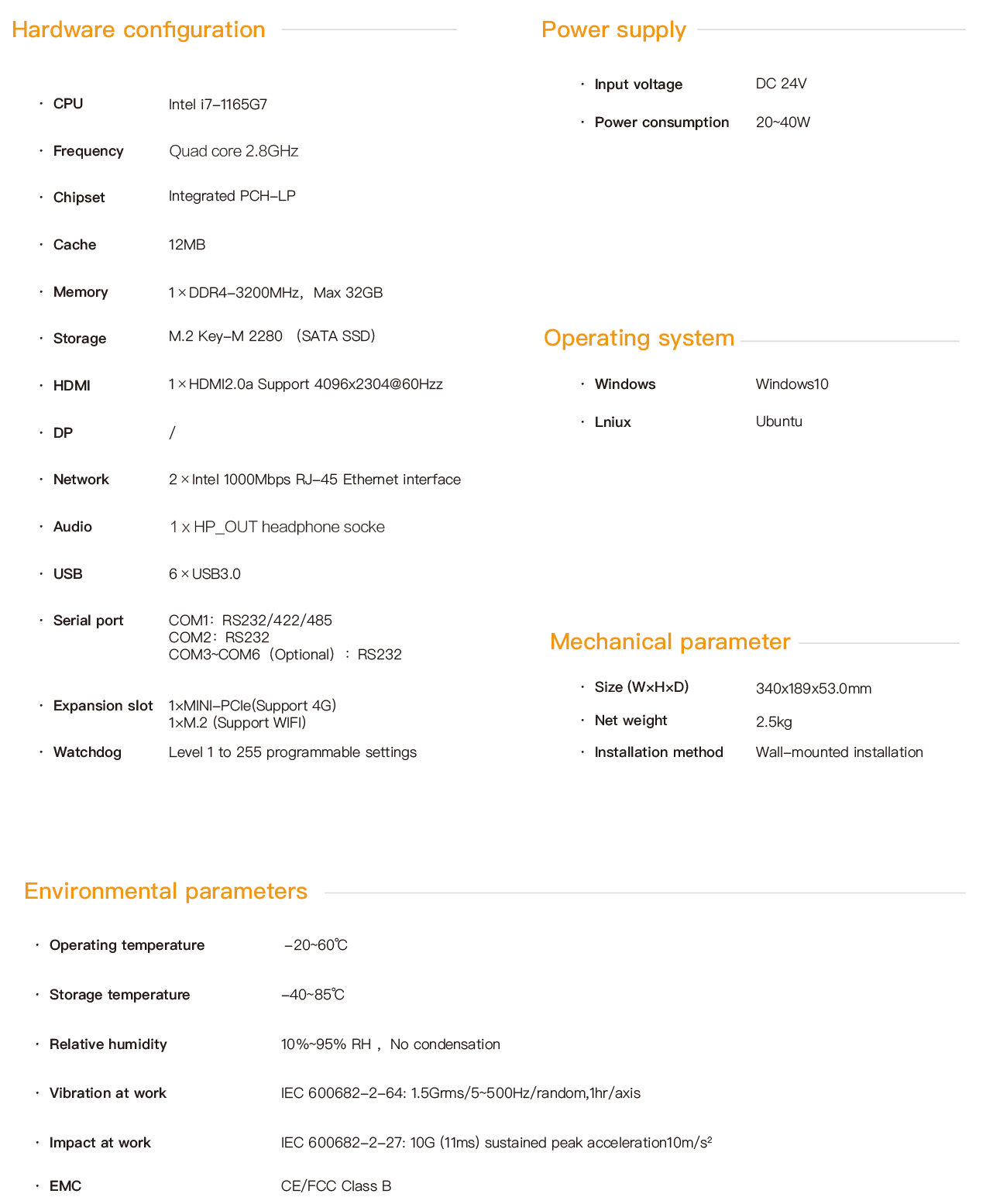 EPC-2872 is a fanless industrial computer based on the high-performance Intel®Intel Core i7-1165G7 processor. The product supports HDMI display interface and is equipped with a rich array of I/O interfaces, including 2 Intel GBE gigabit network ports. 6 USB3.0 ports and 4 optional USB2.0 ports. 1 RS232/RS422/RS485,1 RS232,4 optional RS232 serial ports. One 1× mini-CLE expansion slot for expanding 3G/4G modules, one ×M.2 expansion slot for expanding wireless WIFI, one M.2 hard disk interface for supporting SATA protocol SSD. The system IO interface is equipped with an EMC circuit to ensure the reliability of the product and a lower failure rate. The product features an exquisite and robust design. The large area of aluminum fins quickly dissipates the heat from the processor. The fanless and fully enclosed structure effectively prevents dust from entering, ensuring the product operates reliably for a long time in harsh industrial environments. The whole machine is powered by DC12V to 24V. All interfaces are designed with fastening and have passed CE/FCC certification. It can be applied to harsh industrial sites, and the operating system supports Windows10 and Linux.