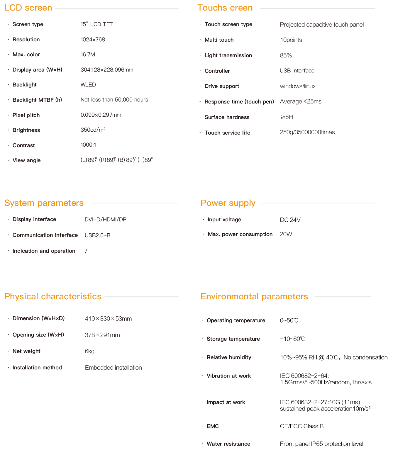 NPD-154 is an embedded ultra-thin industrial touch panel. It is equipped with a 15-inch high-definition LCD screen with a resolution of 1024*768 and a projected multi-point capacitive touch screen. It supports three signal transmission interfaces: HDMI, DVI and DP, as well as multiple USB interface expansions. The maximum communication distance between the PC and the touch panel can reach 15 meters, and the entire machine is powered by DC24V. The front panel has an IP65 protection rating. All interfaces are designed with fastening and have passed CE/FCC certification, making it suitable for demanding human-machine interaction industrial sites.
