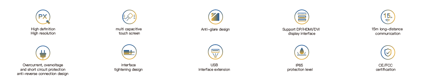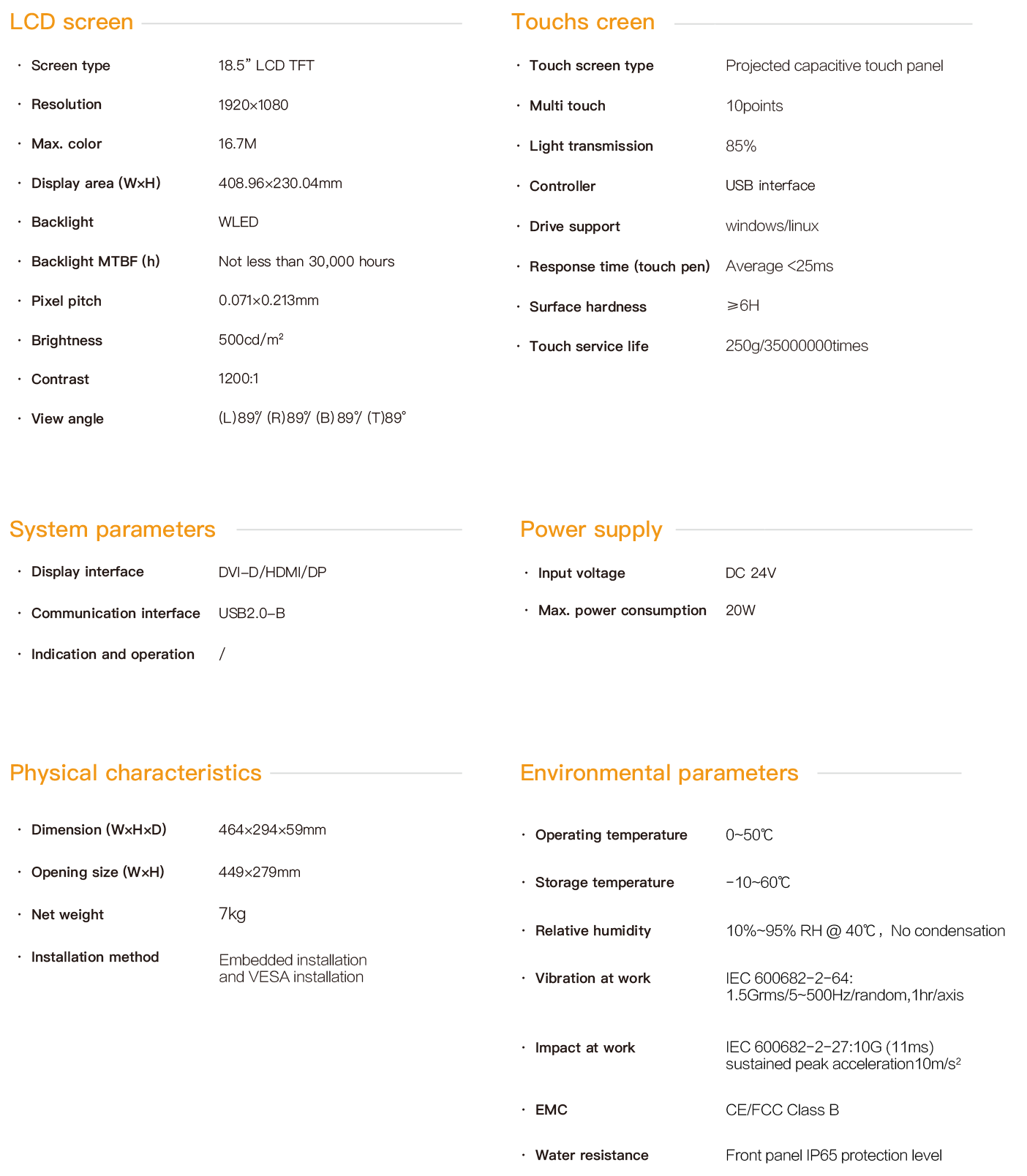 SPD-1900 is an embedded ultra-thin industrial touch panel. It is equipped with an 18.5-inch high-definition LCD screen with a resolution of 1920×1080 and a projected multi-point capacitive touch screen. It supports three signal transmission interfaces: HDMI, DVI and DP, as well as multiple USB interface expansions. The maximum communication distance between the PC and the touch panel can reach 15 meters, and the entire machine is powered by DC24V. The front panel has an IP65 protection rating. All interfaces are designed with fastening and have passed CE/FCC certification, making it suitable for demanding human-machine interaction industrial sites.