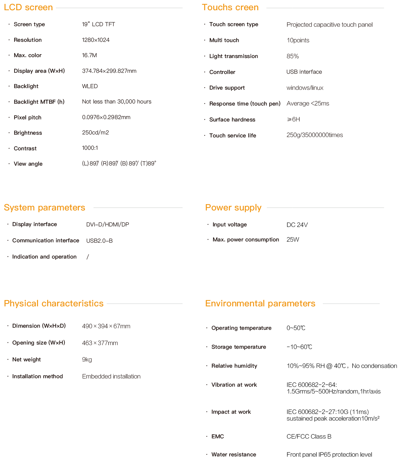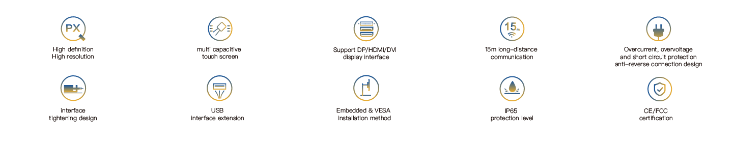 NPD-194 is an embedded ultra-thin industrial touch panel. It is equipped with a 19-inch high-definition LCD screen with a resolution of 1920*1024 and a projected multi-point capacitive touch screen. It supports three signal transmission interfaces: HDMI, DVI and DP, as well as multiple USB interface expansions. The maximum communication distance between the PC and the touch panel can reach 15 meters, and the entire machine is powered by DC24V. The front panel has an IP65 protection rating. All interfaces are designed with fastening and have passed CE/FCC certification, making it suitable for demanding human-machine interaction industrial sites.