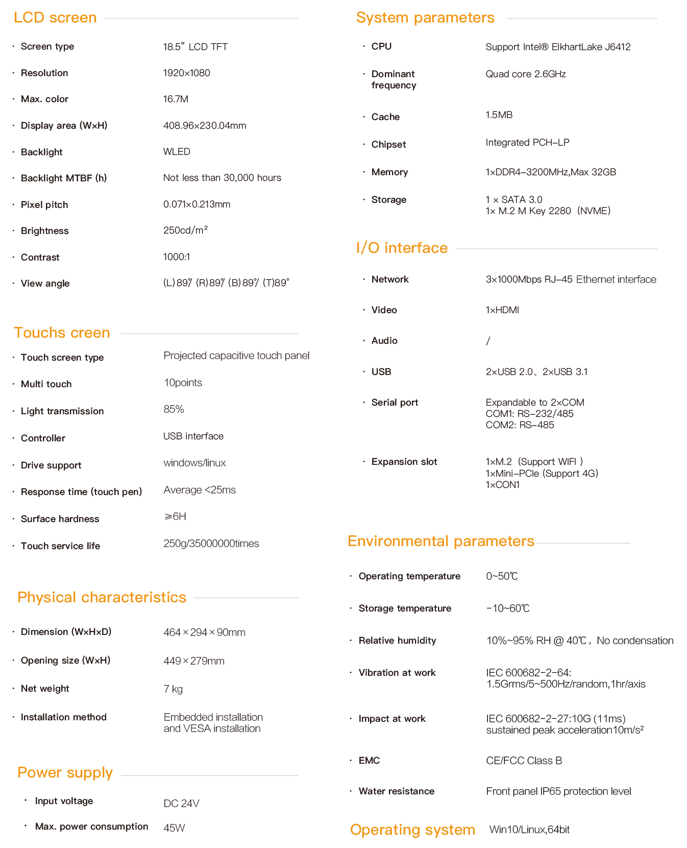SPC-4719L is an embedded industrial capacitive touch tablet computer. It features a fanless quiet design, integrating industrial display and touchscreen technologies. The product is compact, easy to install, and user-friendly, making it an efficient and reliable industrial computer system. The entire machine is equipped with a 18.5-inch high-definition LCD display with a resolution of 1920x1080, featuring rich and detailed colors and a wide viewing angle. It is powered by a 12-24V wide-voltage DC supply, and the touch screen is a projected capacitive type, supporting 10-point touch. The main unit is based on the Intel ElkhartLake processing platform CPU, using the J6412 processor, and is equipped with a large-capacity solid-state SSD. DDR4 memory supports a 1×32G capacity, 4×USB interfaces, 3 Intel gigabit network cards, and can expand 2 COM ports. COM1 port supports RS232/422/485, and COM2 port supports RS232/485. There is an internal Mini-PCIe expansion slot that can support 4G expansion, 1 M.2 for WIFI, and 1 HDMI interface for multi-display mode. The SPC-4719L supports multiple installation methods: hook-and-socket embedded installation, VESA-based wall-mounted and cantilevered installation. The front panel complies with NEMA/IP65 waterproof and dustproof standards, preventing water droplets from splashing in during installation in the control cabinet. The high-strength all-steel sealed box structure has shock and vibration protection functions. The specialized EMC design enables the entire machine to have excellent anti-interference capabilities, capable of adapting to the harsh working environment in industrial sites with strong interference. It is widely used in factory automation, mechanical manufacturing, CNC equipment, textile equipment, communica- tion networks, power automation and other industrial scenarios with strong interference.