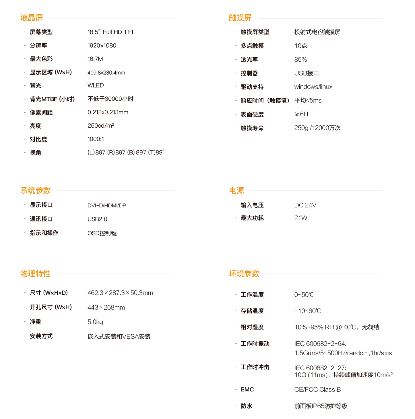 PD-8818是一款嵌入式超薄型工业触控面板,配备18.5”分辨率为1920×1080的高清液晶显示屏、投射式多点电容触摸屏,支持HDMI、DVI、DP三种信号传输接口和多个USB接口扩展,PC与触控面板最远通讯距离可达30米,整机DC 24V供电,前面板IP65防护等级,接口全部采用紧固设计,且通过CE/FCC认证,可适用于严苛的人机交互工业现场。
