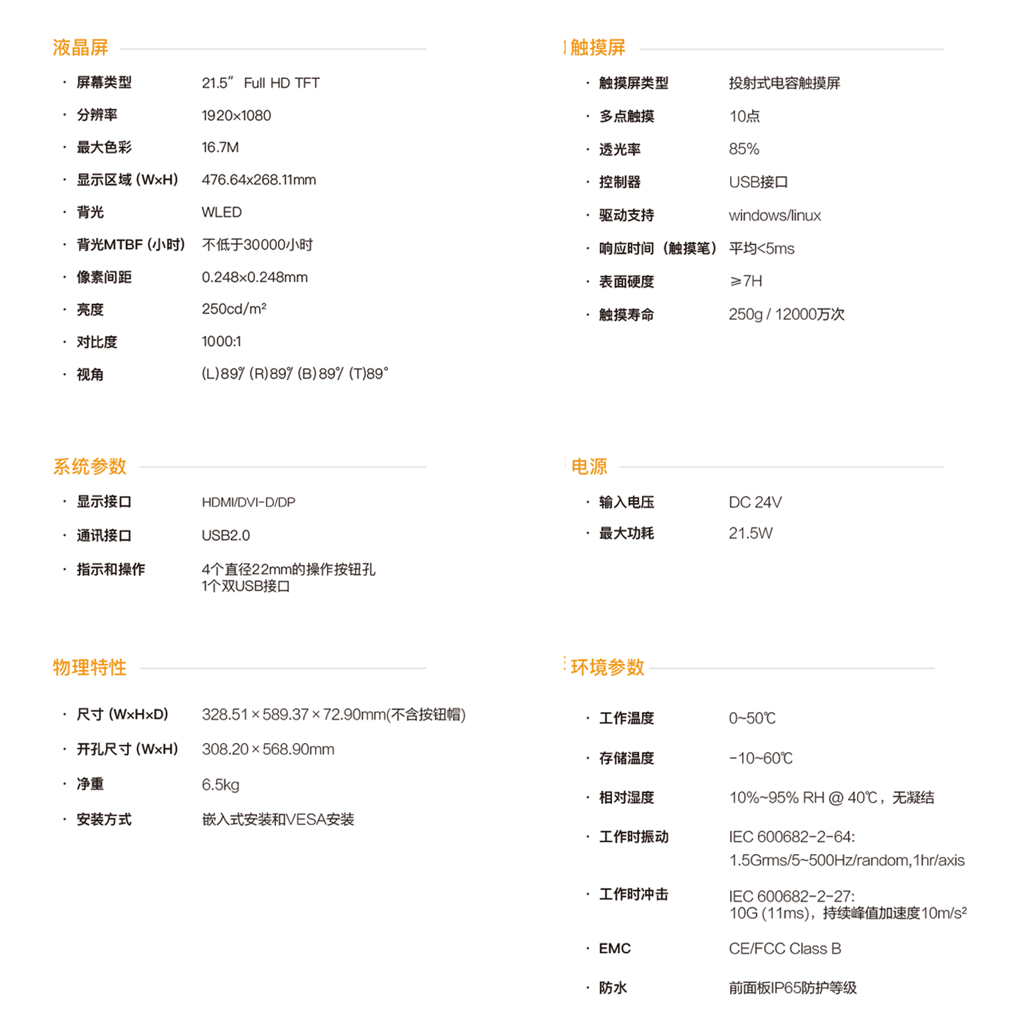 PD-8921是一款嵌入式超薄型带按钮的竖屏工业触控面板,配备21.5”分辨率为1920x1080的高清液晶显示屏、投射式多点电容触摸屏,支持HDMI、DVI、DP三种信号传输接口和多个USB2.0接口扩展,PC与触控面板最远通讯距离可达30米,整机DC24V供电,前面板IP65防护等级,接口全部采用紧固设计,且通过CE/FCC认证,可适用于严苛的人机交互工业现场。