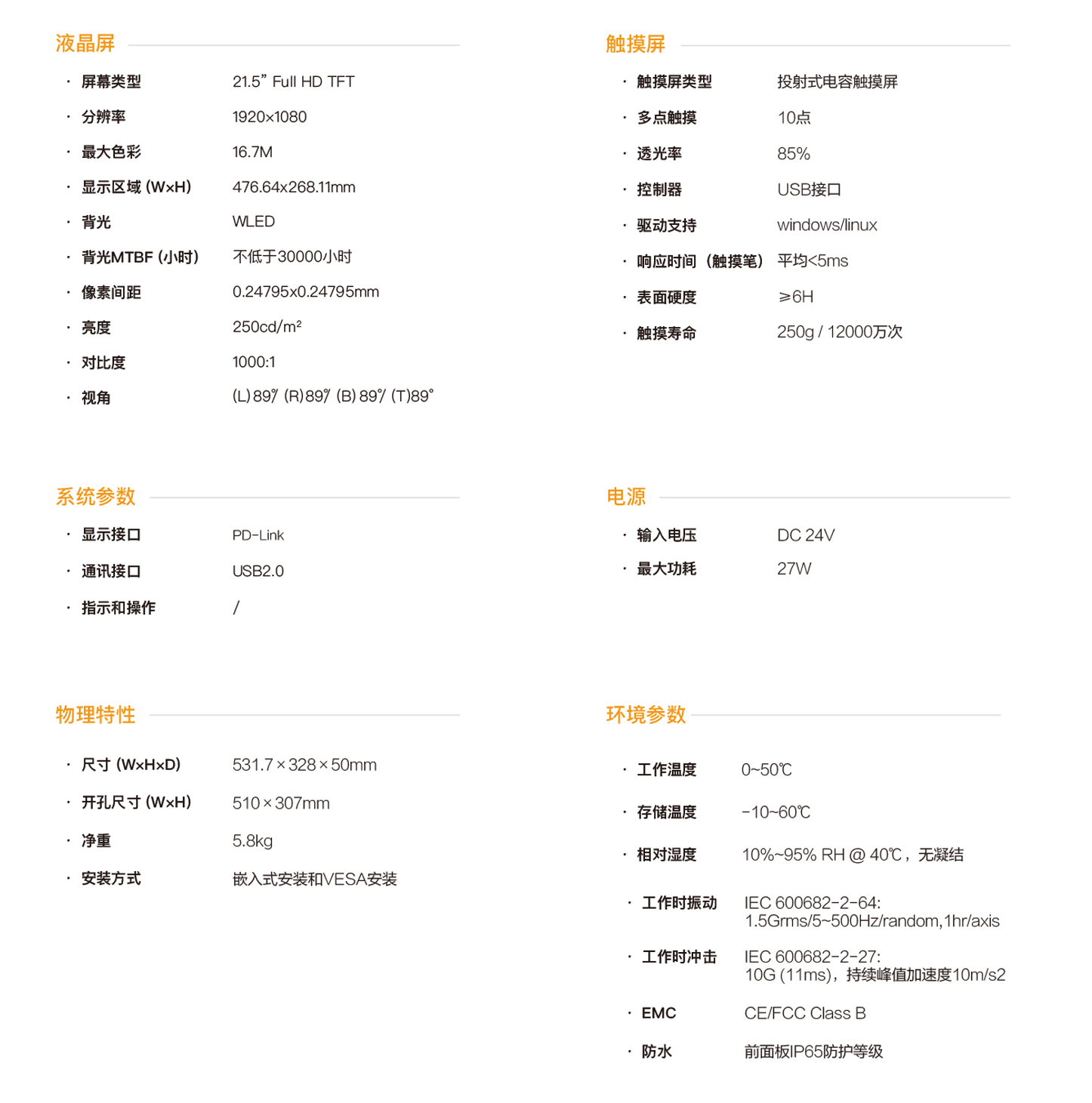 PD-8621是一种高性能工业远传触控显示面板,配备21.5”,分辨率为1920x1080的高清液晶显示屏,支持PD-Link显示接口;触控屏幕采用多点投射式电容触摸屏,。显示与触摸部分有特殊抗干扰设计,可有效抵抗工业现场大功率电机、伺服等干扰,保证良好的显示效果与触控体验,适应各种电磁环境复杂的工业现场。