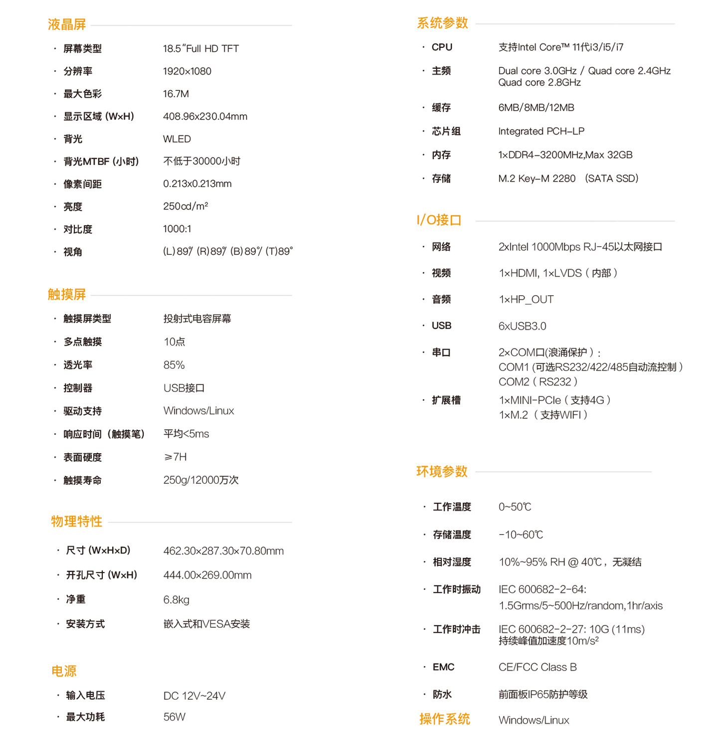 PPC-7618是一款嵌入式工业型电容触控平板电脑,采用无风扇静音设计,产品构成紧凑、易于安装、操控方便。整机采用18.5”分辨率为1920x1080的高清液晶显示屏,触控采用多点投射式电容屏。主机部分采用Intel11代CPU。支持多种安装方式,专门的EMC设计使得机器能够适应工业现场恶劣的工作环境,广泛应用于各种强干扰工业场合。