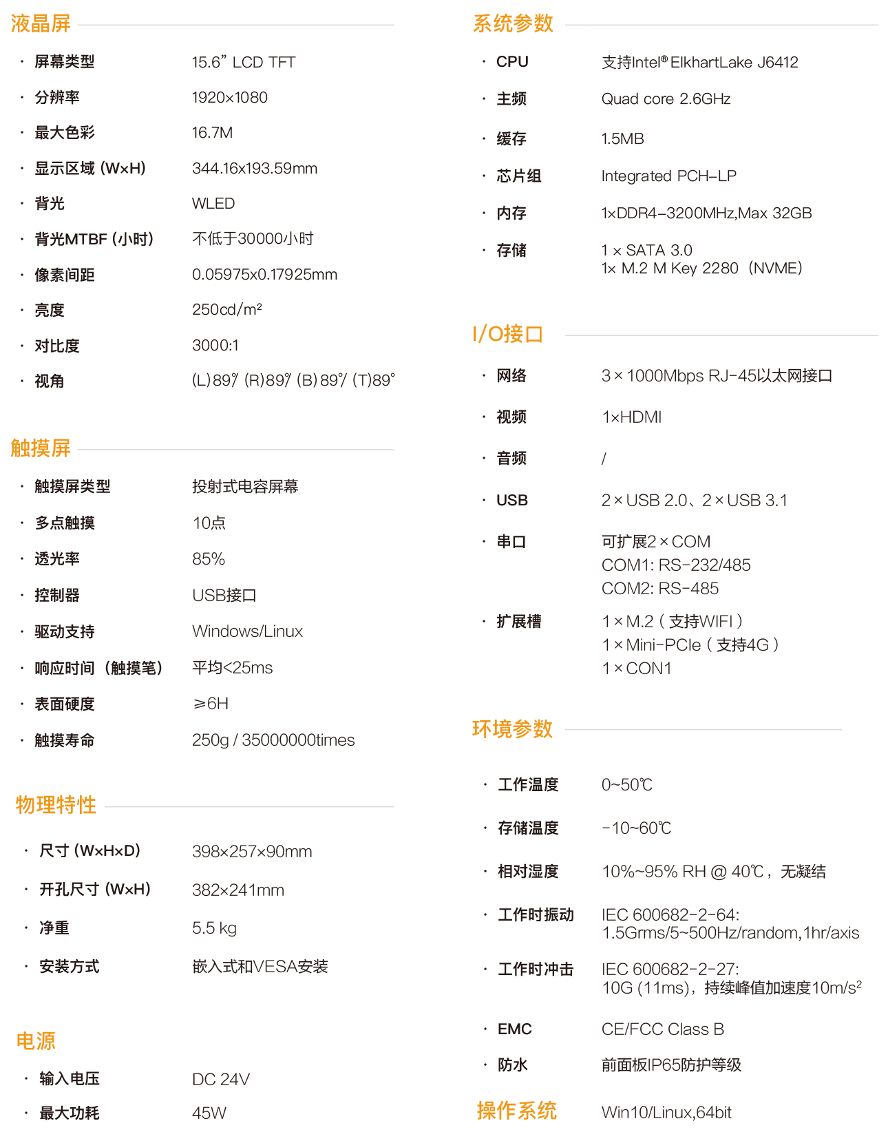 SPC-4715L是一款嵌入式工业型电容触控平板电脑,采用 无风扇静音设计,将工业显示和触摸屏技术相结合,产品构成紧 凑、易于安装、操控方便,是一款高效能、高可靠的工业电脑系 统, 整机采用15.6寸分辨率为1920x1080的高清液晶显示屏,色 彩丰富细腻,视角宽阔,12~24V宽压直流供电,触控采用投射 式电容屏,同时支持10点触摸,主机部基于Intel ElkhartLake处 理平台CPU,采用J6412处理器,配置大容量固态SSD,DDR4 内存支持1×32G容量,4×USB接口,3个intel千兆网卡,可扩展2 个COM口,COM1口支持RS232/422/485,COM2口支持 RS232/485,内部1个Mini-PCIe扩展插槽可支持4G扩展,1个 M.2用于WIFI扩展,1个HDMI接口用于多显示器模式。 SPC-4715L支持多种安装方式:挂钩式嵌入式安装,基于 VESA的壁挂式和悬臂式安装,前面板符合 NEMA/IP65 防水防 尘标准,杜绝安装在控制柜时因现场飞溅的水滴进入,高强度全 钢型密封箱体结构,具有抗冲击和振动防护功能,尤其是专门的 EMC设计使得整机具有优秀的抗干扰能力,能够适应工业现场 恶劣的工作环境,广泛应用于工厂自动化、机械制造、数控设备、 纺织设备、通讯网络以及电力自动化等强干扰工业场合。