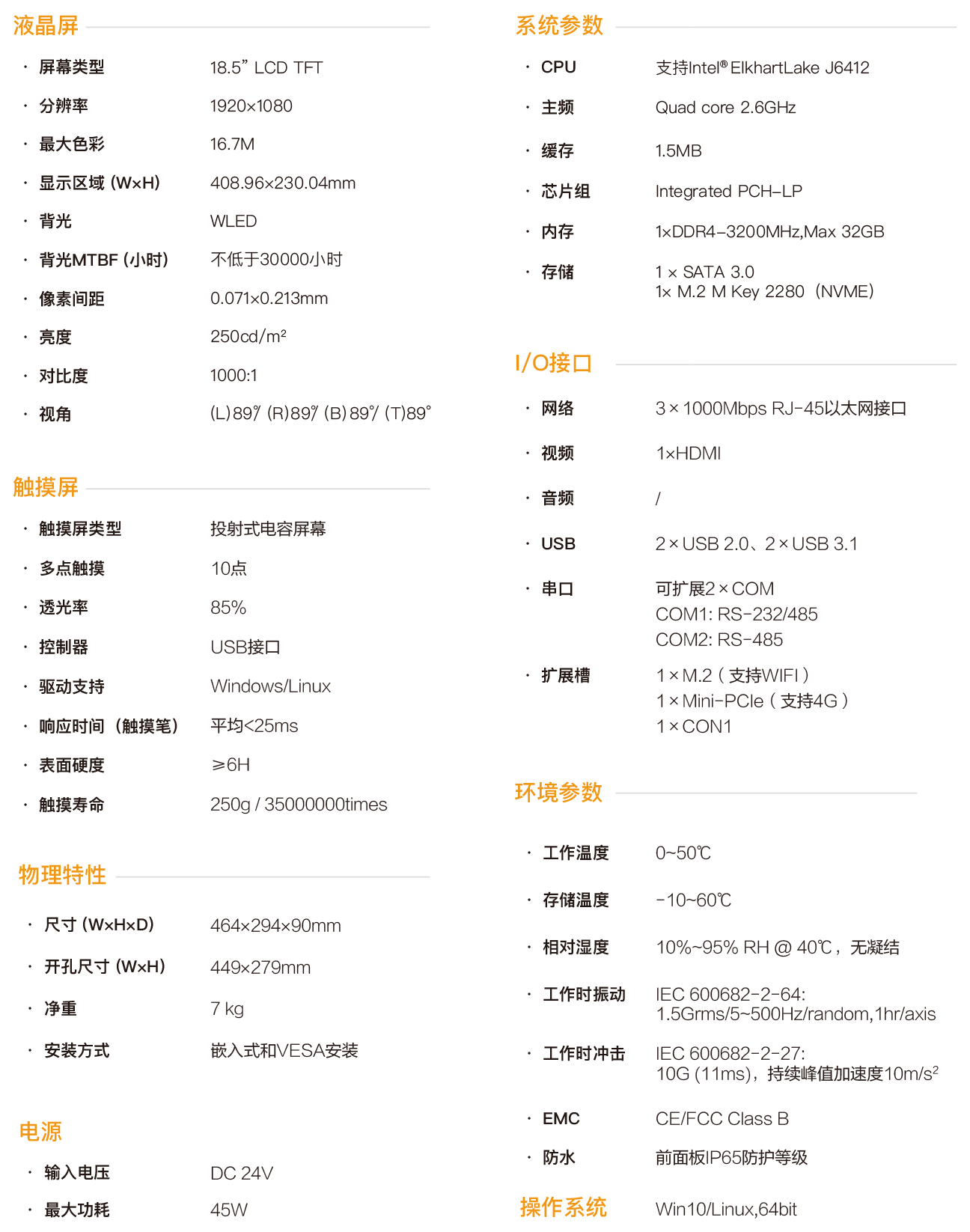 SPC-4719L是一款嵌入式工业型电容触控平板电脑,采用 无风扇静音设计,将工业显示和触摸屏技术相结合,产品构成紧 凑、易于安装、操控方便,是一款高效能、高可靠的工业电脑系 统, 整机采用18.5寸分辨率为1920x1080的高清液晶显示屏,色 彩丰富细腻,视角宽阔,12~24V宽压直流供电,触控采用投射 式电容屏,同时支持10点触摸,主机部基于Intel ElkhartLake处 理平台CPU,采用J6412处理器,配置大容量固态SSD, DDR4 内存支持1×32G容量,4×USB接口, 3个intel千兆网卡,可扩展2 个COM口,COM1口支持RS232/422/485,COM2口支持 RS232/485,内部1个Mini-PCIe扩展插槽可支持4G扩展,1个 M.2用于WIFI,1个HDMI接口用于多显示器模式。 SPC-4719L支持多种安装方式:挂钩式嵌入式安装,基于 VESA的壁挂式和悬臂式安装,前面板符合 NEMA/IP65 防水防 尘标准,杜绝安装在控制柜时因现场飞溅的水滴进入,高强度全 钢型密封箱体结构,具有抗冲击和振动防护功能,尤其是专门的 EMC设计使得整机具有优秀的抗干扰能力,能够适应工业现场 恶劣的工作环境,广泛应用于工厂自动化、机械制造、数控设备、 纺织设备、通讯网络以及电力自动化等强干扰工业场合。