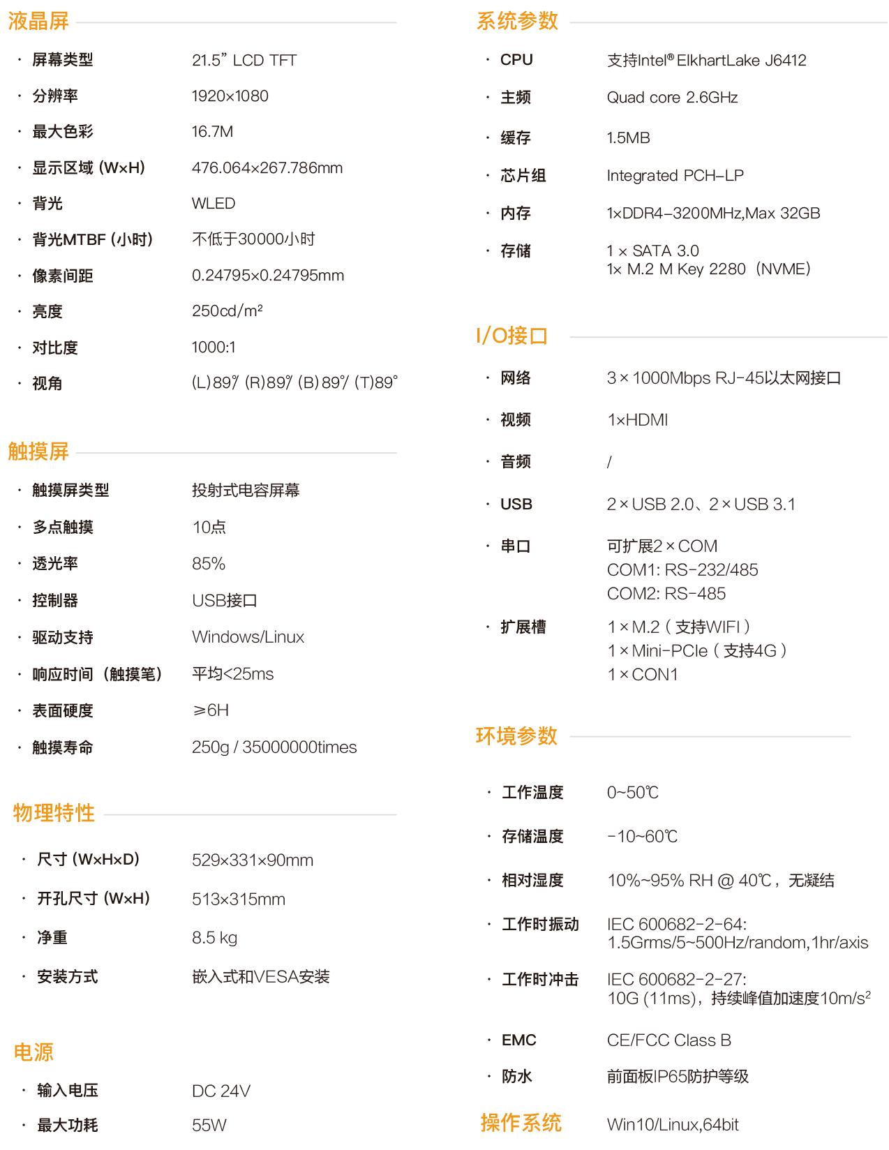SPC-4722L是一款嵌入式工业型电容触控平板电脑,采用 无风扇静音设计,将工业显示和触摸屏技术相结合,产品构成紧 凑、易于安装、操控方便,是一款高效能、高可靠的工业电脑系 统, 整机采用21.5寸分辨率为1920x1080的高清液晶显示屏,色 彩丰富细腻,视角宽阔,12~24V宽压直流供电,触控采用投射 式电容屏,同时支持10点触摸,主机部基于Intel ElkhartLake处 理平台CPU,采用J6412处理器,配置大容量固态SSD, DDR4 内存支持1×32G容量,4×USB接口,3个intel千兆网卡,可扩展2 个COM口,COM1口支持RS232/422/485,COM2口支持 RS232/485,内部1个Mini-PCIe扩展插槽可支持4G扩展,1个 M.2用于WIFI扩展,1个HDMI接口用于多显示器模式。 SPC-4722L支持多种安装方式:挂钩式嵌入式安装,基于 VESA的壁挂式和悬臂式安装,前面板符合 NEMA/IP65 防水防 尘标准,杜绝安装在控制柜时因现场飞溅的水滴进入,高强度全 钢型密封箱体结构,具有抗冲击和振动防护功能,尤其是专门的 EMC设计使得整机具有优秀的抗干扰能力,能够适应工业现场 恶劣的工作环境,广泛应用于工厂自动化、机械制造、数控设备、 纺织设备、通讯网络以及电力自动化等强干扰工业场合。