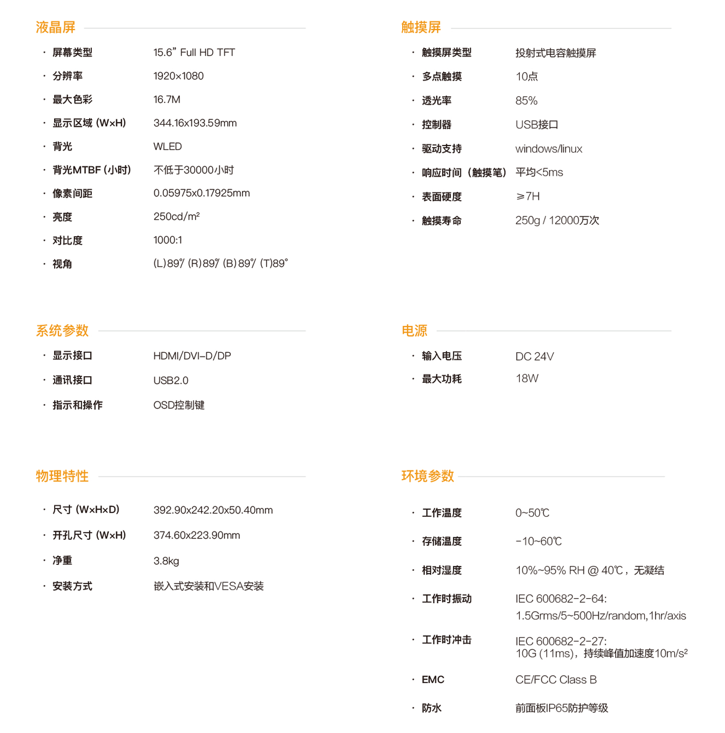 PD-8815是一款嵌入式超薄型工业触控面板,配备15.6”分辨率为1920x1080的高清液晶显示屏、投射式多点电容触摸屏,支持HDMI、DVI、DP三种信号传输接口和多个USB2.0接口扩展,PC与触控面板最远通讯距离可达30米,整机DC24V供电,前面板IP65防护等级,接口全部采用紧固设计,且通过CE/FCC认证,可适用于严苛的人机交互工业现场。