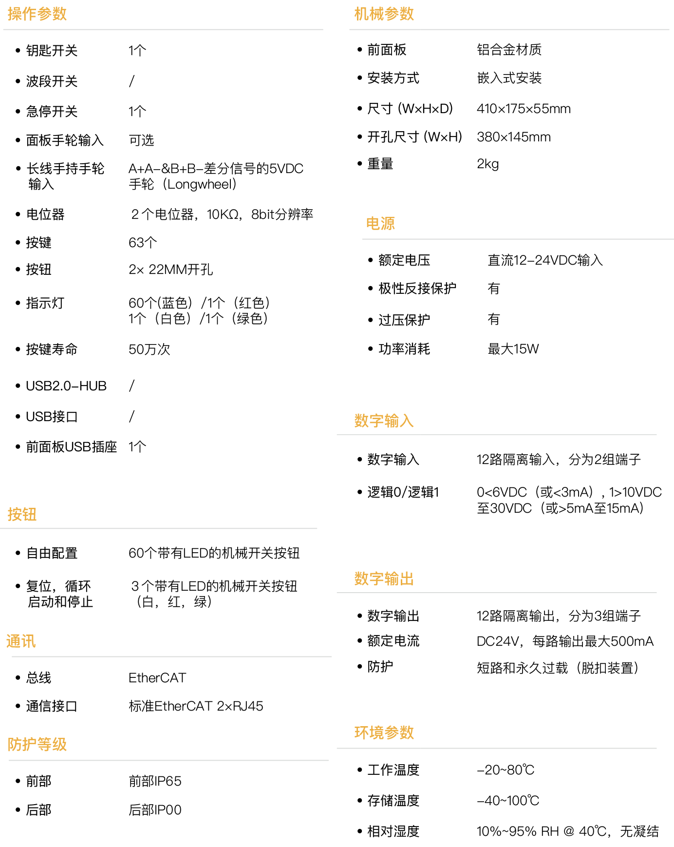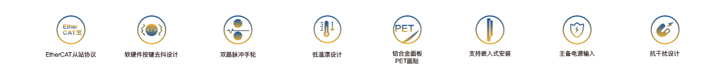EC-8107是一款EtherCAT工业总线操作面板,适用于CNC数控系统,可实现精准可靠的人机互动,配备了63个操作按键,63个状态指示灯,2个脉冲手轮接口(1个差分,1个单端),2个256档倍率电位器,倍率设定可选21档波段选择开关,1个三档钥匙开关,12路隔离GPO和12路隔离GPI,以及独立的急停开关,默认直流24V输入(主备双路),整机采用抗干扰设计,可有效抵抗工业现场大功率电机、伺服等干扰,具有良好的操作体验。