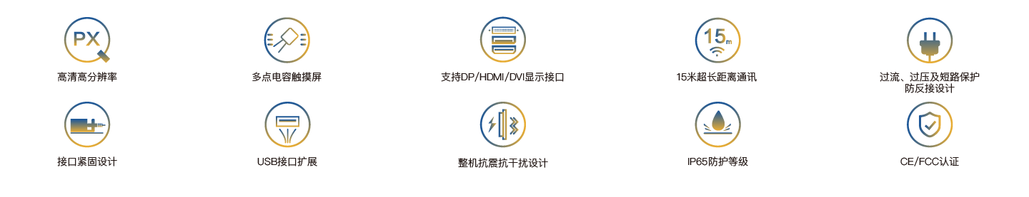 NPD-194是一款嵌入式超薄型工业触控面板,配备19寸分辨率1920×1024的高清液晶显示屏、投射式多点电容触摸屏,支持HDMI、DVI、DP三种信号传输接口和多个USB接口扩展,PC与触控面板最远通讯距离可达15米,整机DC24V供电,前面板IP65防护等级,接口全部采用紧固设计,且通过CE/FCC认证,可适用于严苛的人机交互工业现场。