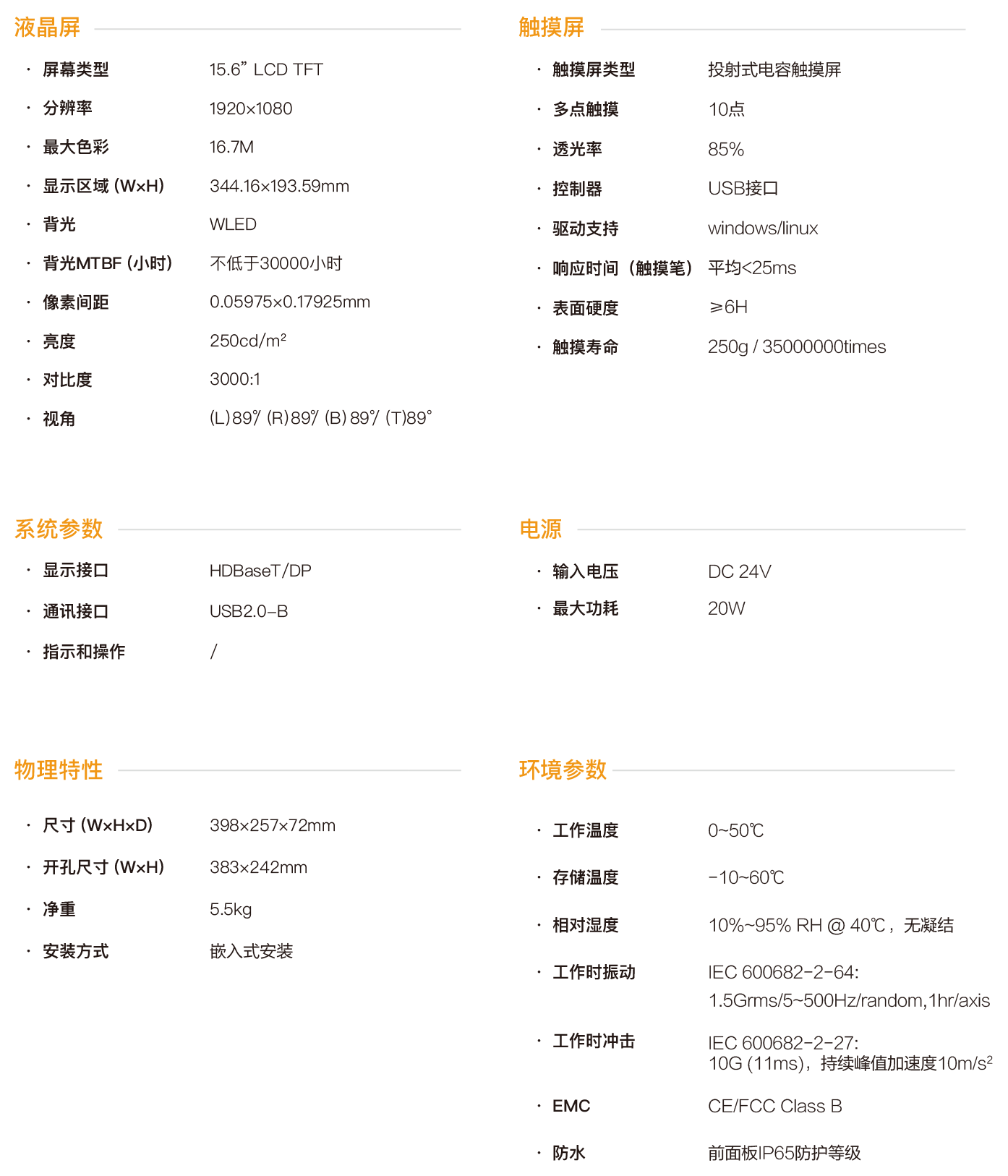 SPD-1500E是一款嵌入式超薄型工业触控面板,配备15.6寸分辨率为1920×1080的高清液晶显示屏、投射式多点电容触摸屏,支持 HDBaseT和 DP信号传输接口,多个USB接口扩展,PC与触控面板最远通讯距离可达100米,整机DC24V供电,前面板IP65防护等级,接口全部采用紧固设计,且通过CE/FCC认证,可适用于严苛的人机交互工业现场。