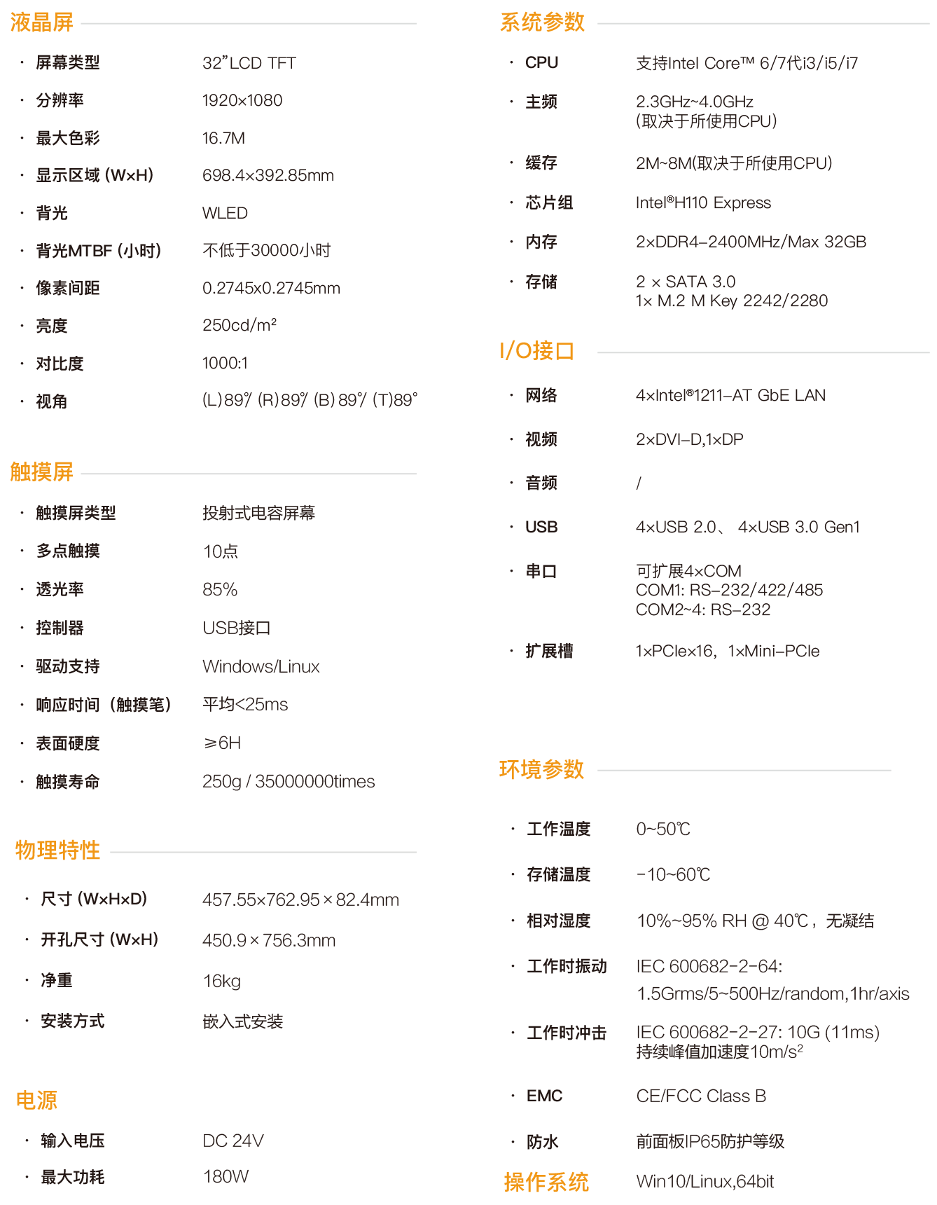 HPC-9632是一款工业型电容触控平板电脑,将工业显示和触摸屏技术相结合,产品结构紧凑、易于安装、操控方便,是一款高效能、高可靠的工业电脑系统,整机采用32寸分辨率为1920*1080的高清液晶显示屏,色彩丰富细腻,视角宽阔,24V直流供电,采用投射式10点电容屏,主机部分搭载Intel Core 6/7代CPU,可配置大容量固态SSD,内存支持最大32G容量。 HPC-9632支持挂钩式嵌入式安装,前面板符合IP65防水防尘标准,杜绝安装在控制柜时因现场飞溅的水滴进入,高强度全钢型箱体结构,具有抗冲击和振动防护功能,尤其是专门的EMC设计使得整机具有优秀的抗干扰能力,能够适应工业现场恶劣的工作环境,广泛应用于工厂自动化、机械制造、数控设备、纺织设备、通讯网络以及电力自动化等强干扰的工业现场。