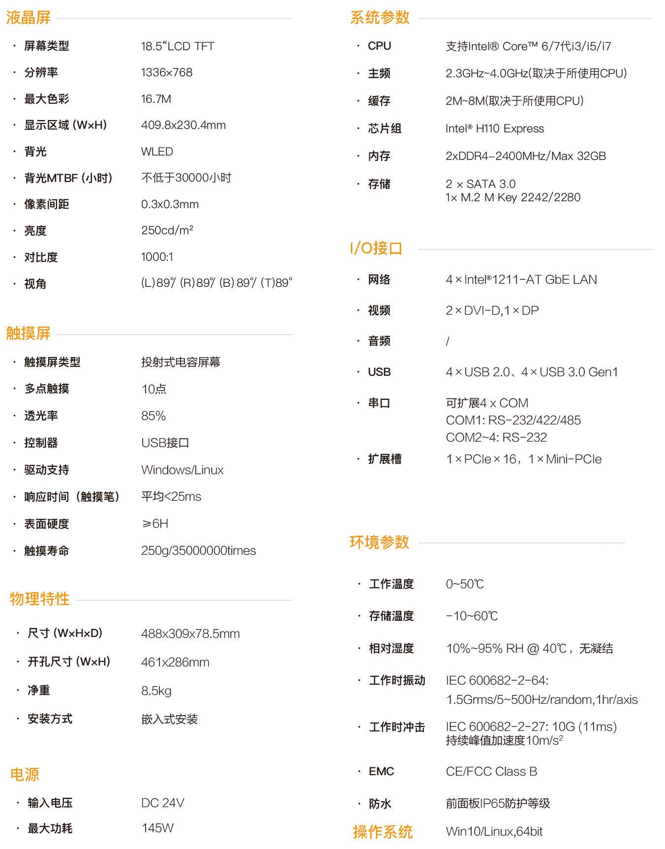 NPC-184i是一款工业型电容触控平板电脑,将工业显示和触摸屏技术相结合,产品结构紧凑、易于安装、操控方便,是一款高效能、高可靠的工业电脑系统,整机采用18.5寸分辨率为1366×768的高清液晶显示屏,色彩丰富细腻,视角宽阔,24V直流供电,采用投射式10点电容屏,主机部分搭载Intel Core 6/7代CPU,可配置大容量固态SSD,内存支持最大32G容量。 NPC-184i支持挂钩式嵌入式安装,前面板符合IP65防水防尘标准,杜绝安装在控制柜时因现场飞溅的水滴进入,高强度全钢型箱体结构,具有抗冲击和振动防护功能,尤其是专门的EMC设计使得整机具有优秀的抗干扰能力,能够适应工业现场恶劣的工作环境,广泛应用于工厂自动化、机械制造、数控设备、纺织设备、通讯网络以及电力自动化等强干扰的工业现场。