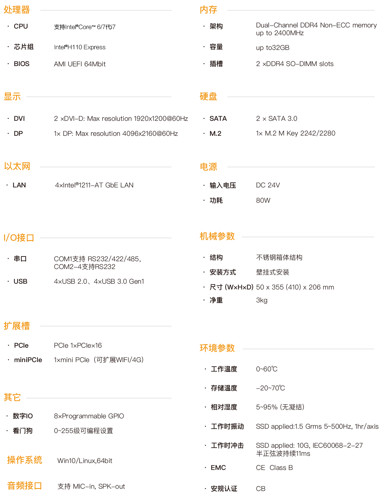EPC-9974L是一款基于Intel Core 6/7代高性能处理器的工业计算机,可配置大容量固态SSD,内存支持最大32G容量,支持DVI/DP显示接口,4个Intel GbE千兆网口,4个USB3.0,4个USB2.0接口,COM1支持RS232/RS422/RS485,COM2支持 RS232,整机24V直流供电,接口全部采用紧固设计,且通过CE/FCC认证,可适用于严苛的工业现场, 操作系统支持Windows10 和Linux。